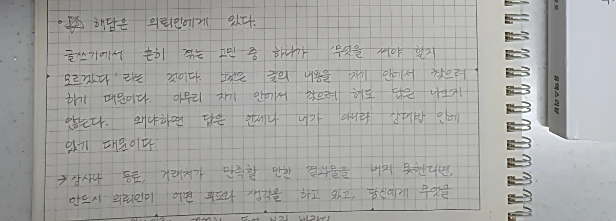 문제의 답은 상대방에서 찾는 연습을 회사 생활과 글쓰기 두 분야에서 모두 적용해도 될 것 같다.