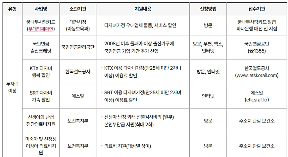 제가 해당되는 두 자녀 이상일 경우 지원받을 수 있는 혜택은 "꿈나무사랑카드 발급"과 "KTX 다자녀 행복 할인", "SRT 다자녀 가족 할인"이 있었습니다.