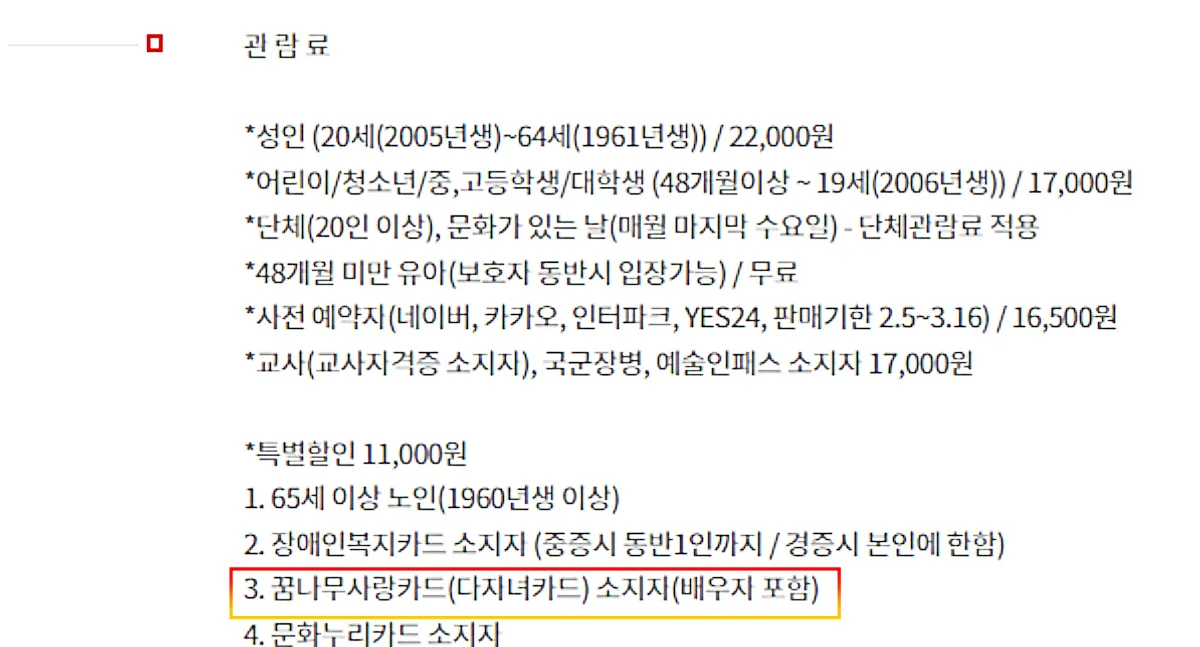고흐 전시전 관람 금액이 성인은 22,000원인데 꿈나무사랑카드 소지자는 배우자포함해서 50% 할인된 11,000 가격으로 관람할 수 있어요.