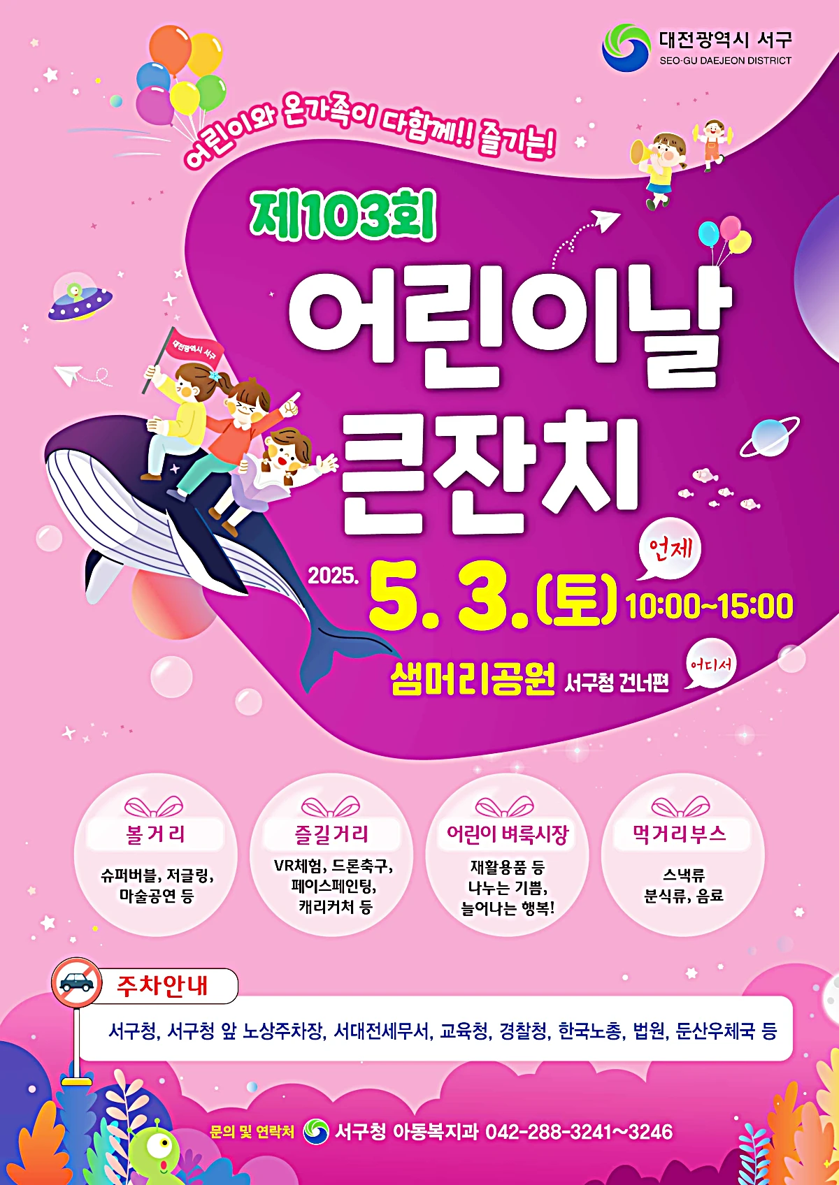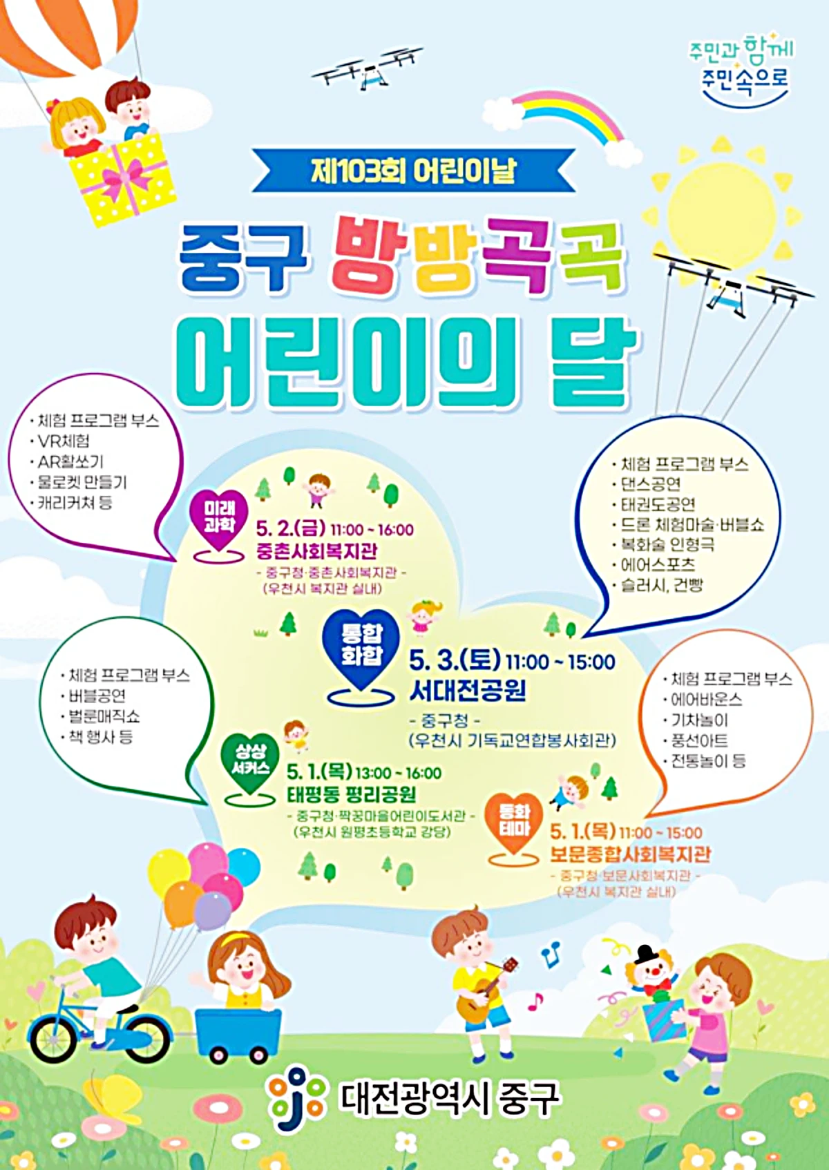 대전 동구는 5월 3일 대전대학교 맥센터에서 축하공연, 체험부스, 어린이 벼룩시장 등 다양한 프로그램이 포함된 ‘어린이날 큰잔치’를 진행하네요.