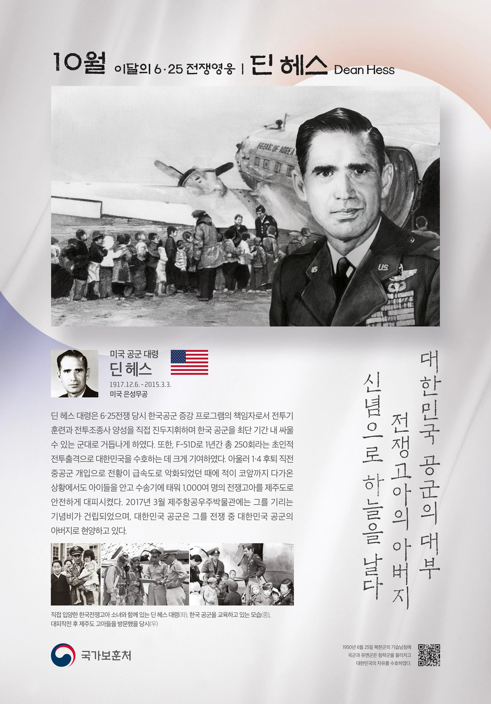 딘 헤스 대령은 미국 공군 조종사로 6.25 전쟁 당시 대한민국 공군의 전력을 강화하는 임무를 맡았다고 합니다.