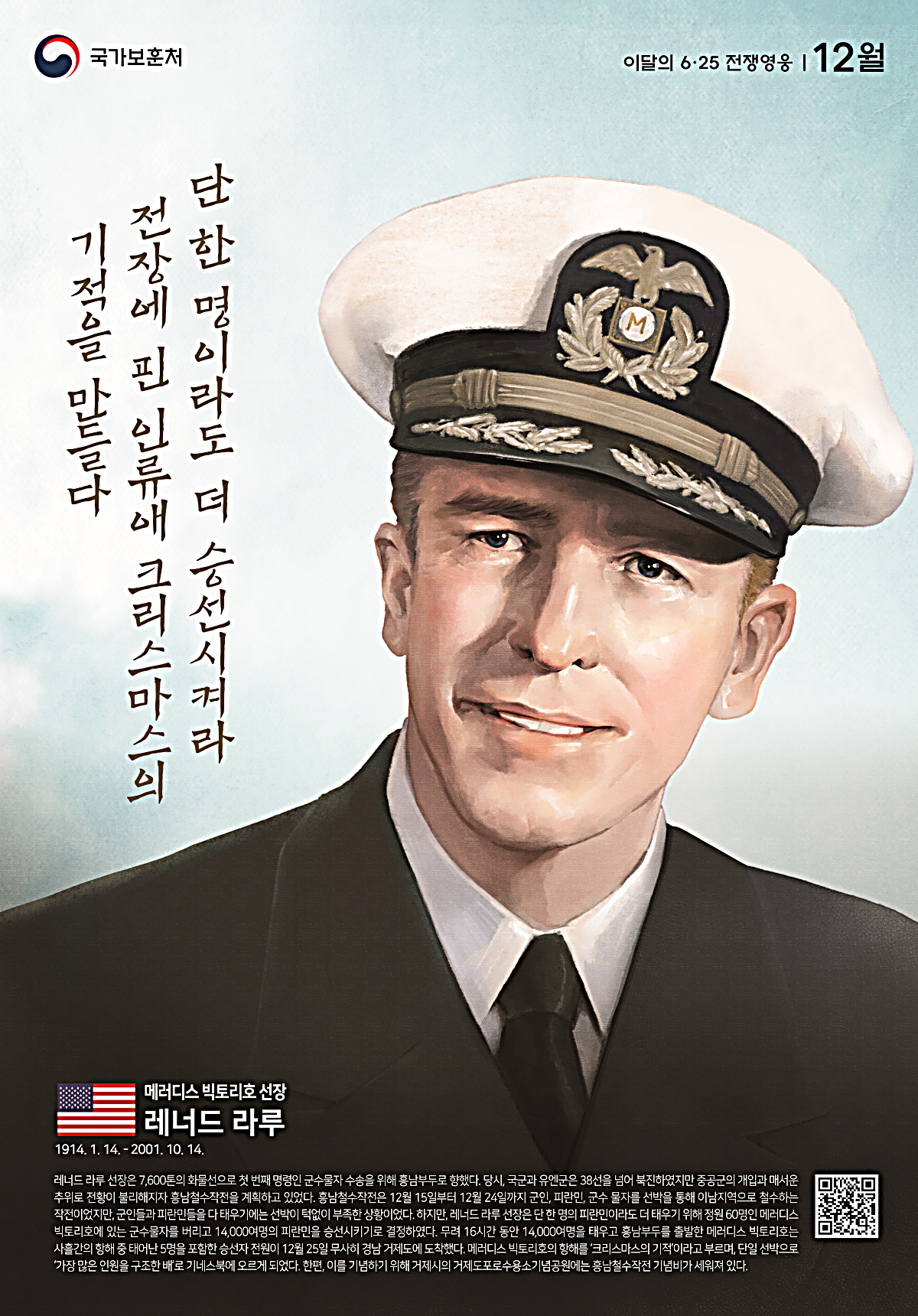 레너드 라루 선장은 메러디스 빅토리호를 지휘한 인물로, 한국전쟁 당시 1950년 12월 흥남철수작전 중 메러디스 빅토리호에 정원(약 60명)의 200배가 넘는 14,000명의 피난민을 승선시켜 안전하게 남쪽으로 철수시켰습니다.