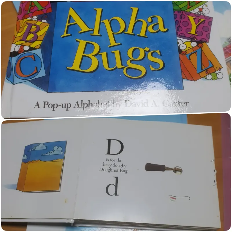 위 사진처럼 표지 상태는 좋은 편인데, 하나씩 페이지를 넘기다 보니, 알파벳 D를 설명하는 돌아가는 도넛 모양이 있었는데, 도넛은 떨어져 나갔더라고요. 이러면 판매가 어렵다는 겁니다.