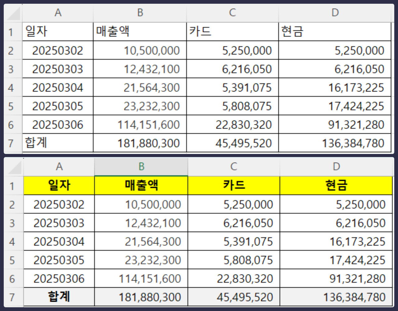 표의 헤더(제목) 부분은 습관적으로 음영 처리와 가운데 정렬을 적용하면 데이터가 한눈에 들어오고 가독성이 높아집니다. 음영 처리와 정렬을 적용하기 전후를 비교해보면 훨씬 이해하기 쉬워질 겁니다.