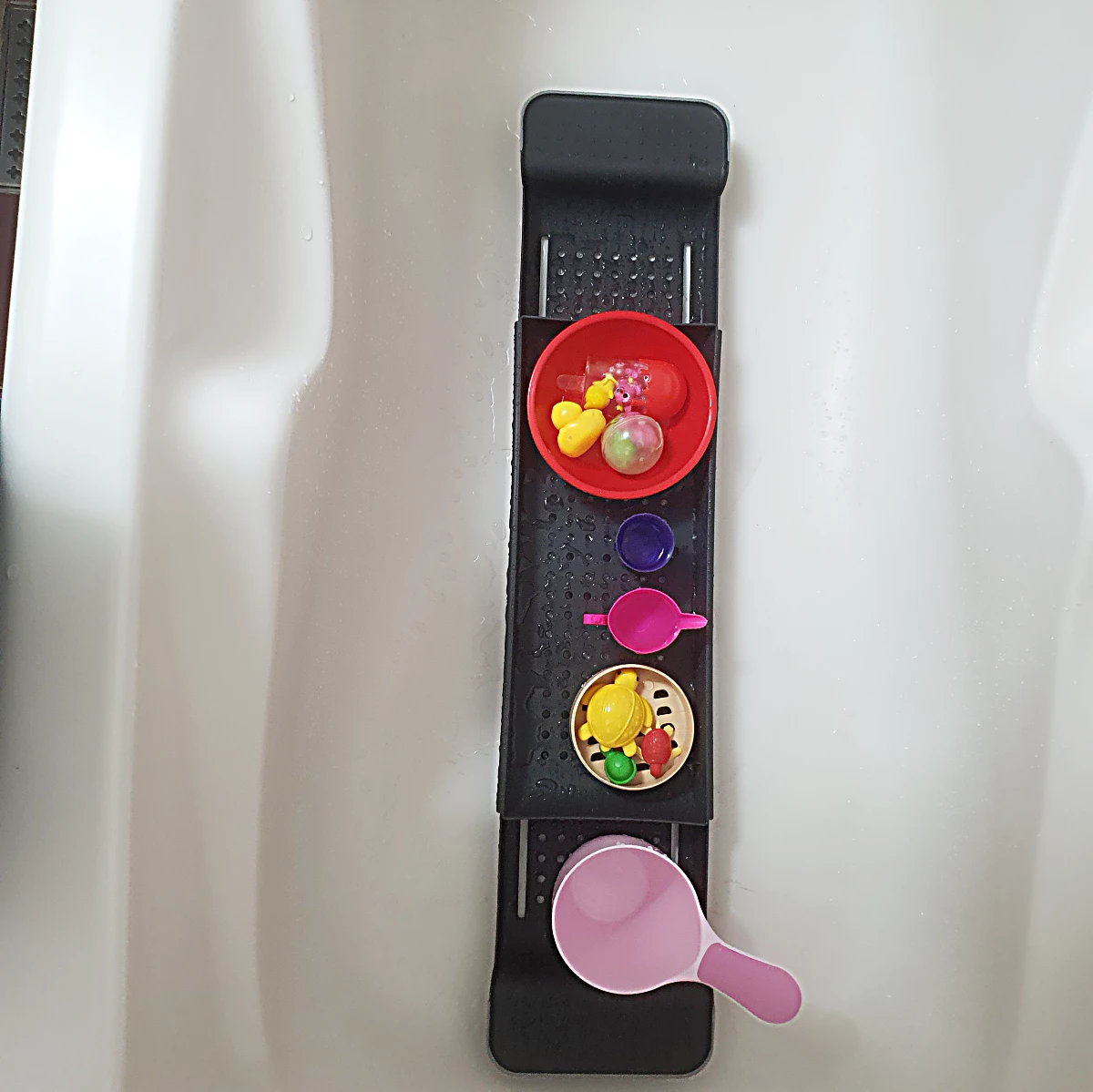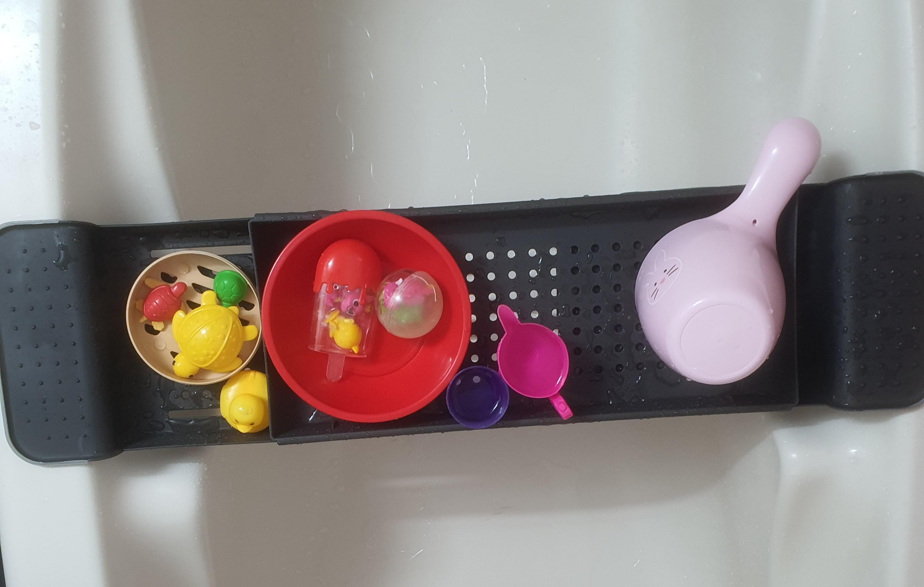 그러다 발견한 게 바로 욕조 트레이! 설치도 필요 없고 활용도도 높아서 아이도 즐겁고, 저는 잠깐의 여유도 생겼습니다.