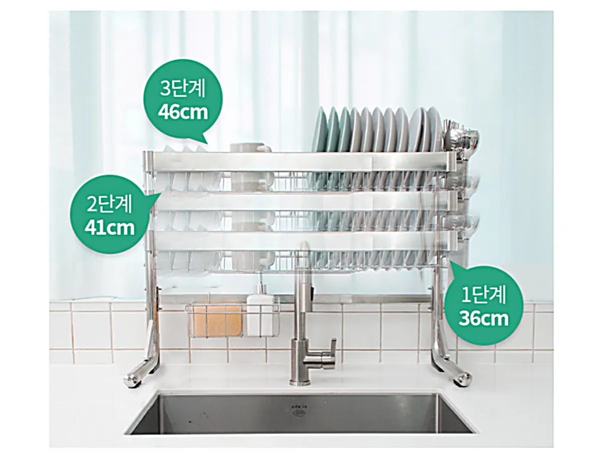 높이 조절도 마찬가지로 개수대 위로 설치된 수납장의 길이를 생각해야 합니다. 개수대와 수납장 사이의 비어 있는 공간 높이를 잘 재어서 1단으로 구매할지 2단으로 구매할지, 길이조절이 되는 것으로 할지 결정하면 됩니다.