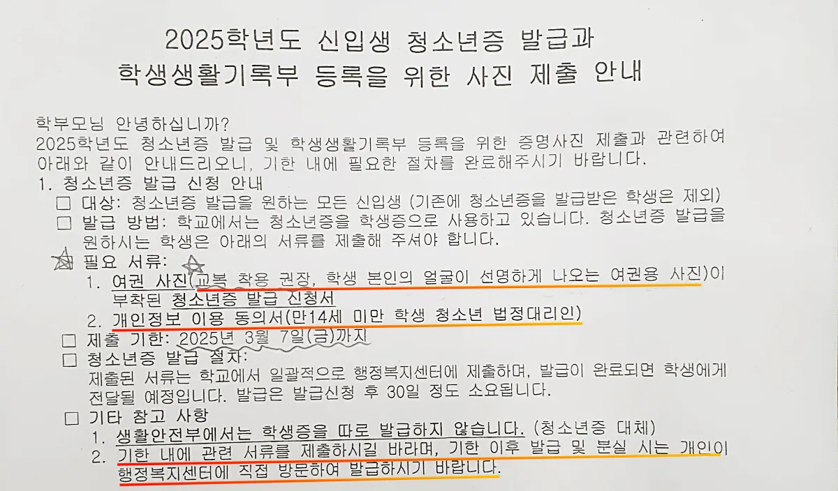 청소년증 발급을 위한 여권용 사진과 개인정보 동의서