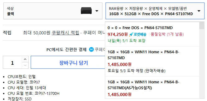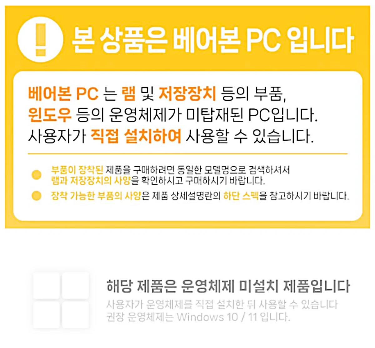 장치 부품, 윈도우의 운영체제가 미 탑재된 PC라서 제품 선택 시 옵션을 잘 확인해야 합니다. 어디까지 탑재된 걸 구매 하느냐에 따라서, 가격이 조금씩 차이가 납니다.