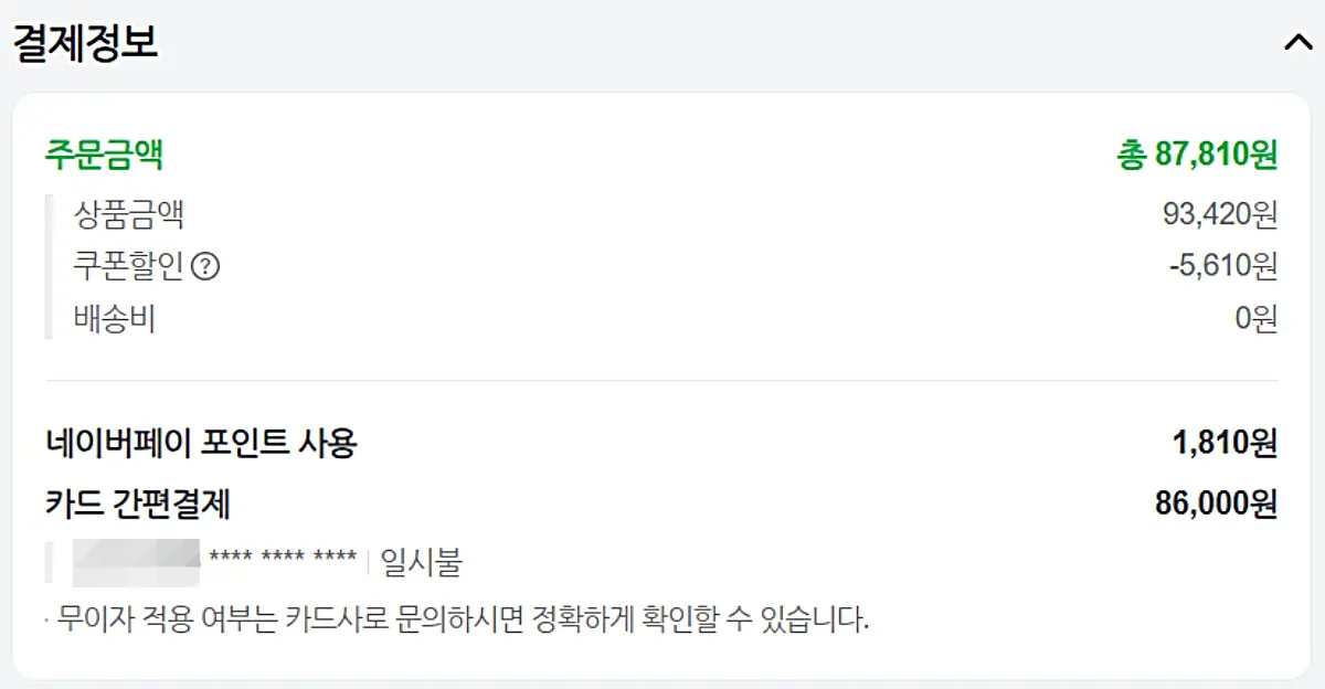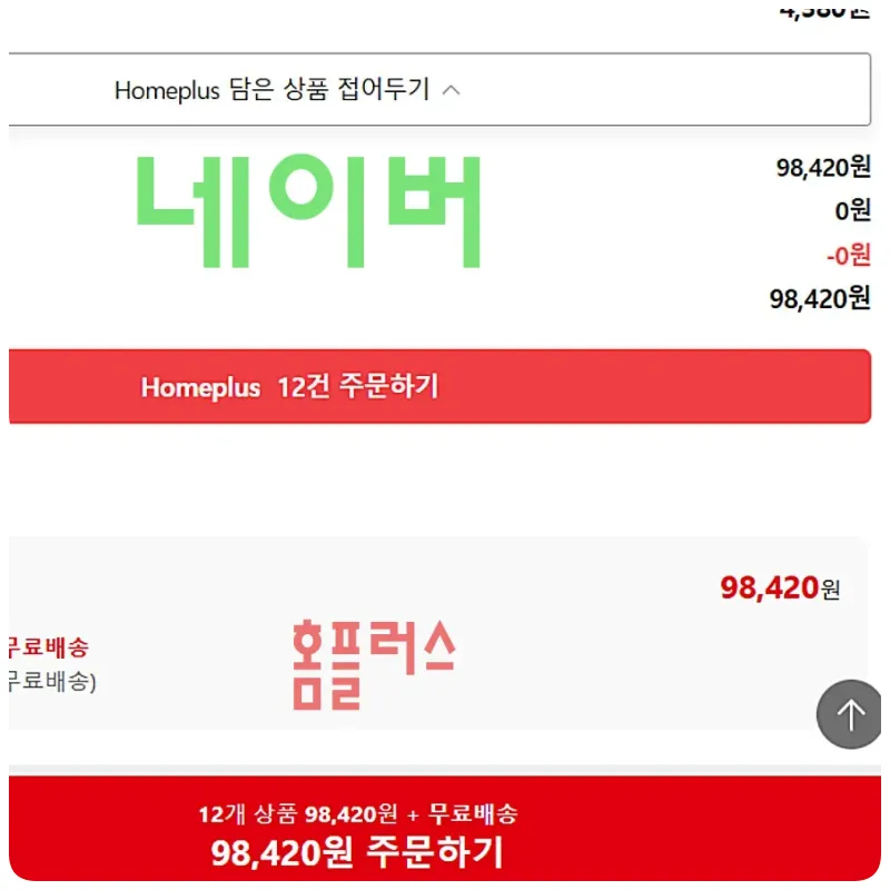 만약, 홈플러스 인터넷몰에서 구매했다면 98,420원에 결제했을 것을 네이버 장보기에서 구매한 결과 87,810원에 결제 금액이 합산되었습니다.