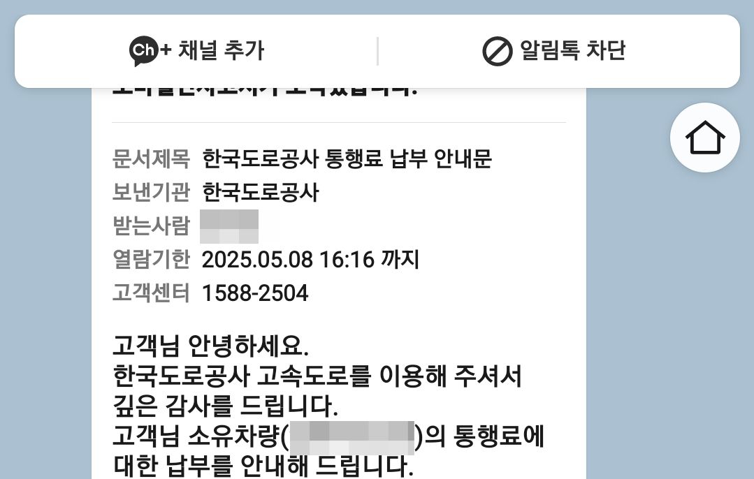 고속도로 이용은 4월2일에 하고, 알림톡 고지서는 5월7일에 받았습니다.